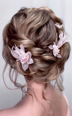 This is one of those bridal hairstyles for weddings that give you that “just-woke-up-in-a-fairytale” look; effortless, dreamy, and super romantic. You can choose flowers that match your wedding theme. Fresh or faux; both work!